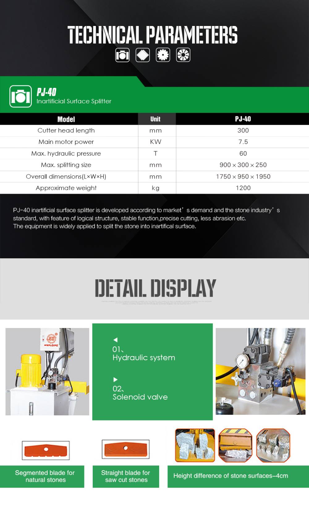 جهاز تقسيم السطح الصناعي PJ-40/60 تم تطويره وفقًا لمتطلبات السوق ومعايير صناعة الحجر, بميزة البنية المنطقية, وظائف مستقرة,قطع دقيق, تآكل أقل إلخ.