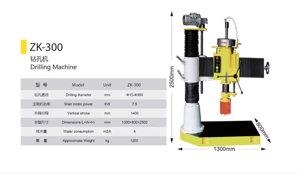 آلة الحفر ZK-300 لديها كفاءة عمل عالية, عملية بسيطة ومرنة, والتصميم الهيكلي المعقول, ويفضل بشدة من قبل العملاء. يمكن استخدام آلة الحفر ZK-300 لمعالجة أحواض شواهد القبور, أعمدة حجرية, مقاعد حجرية, الخ.