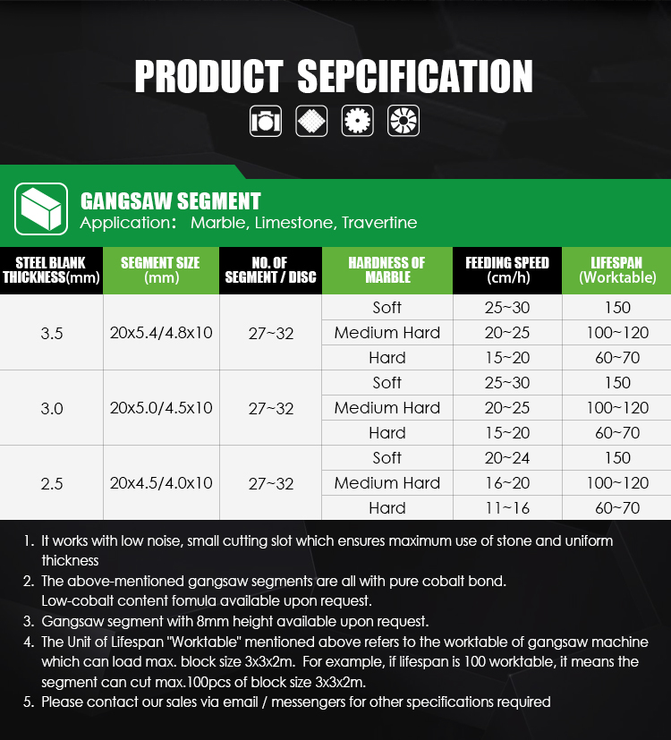 4. The Unit of Lifespan “Worktable” mentioned above refers to the worktable of gangsaw machine which can load max. block size 3x3x2m. Bijvoorbeeld, if lifespan is 100 worktable, it means the segment can cut max.100pcs of block size 3x3x2m.