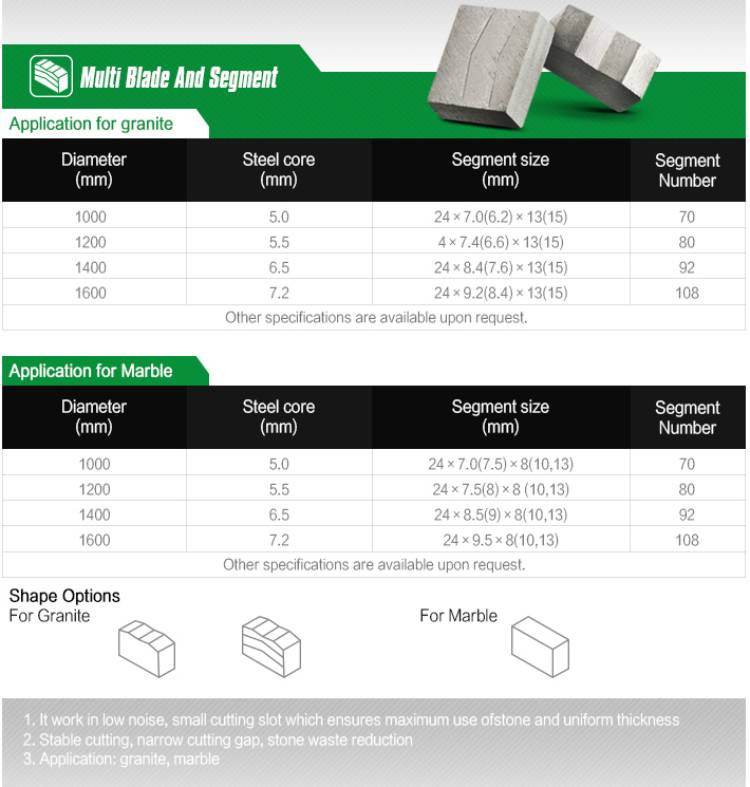 | Diameter(mm) | Steel core(mm) | Head size(mm) | Segment Number | Shape | Application |