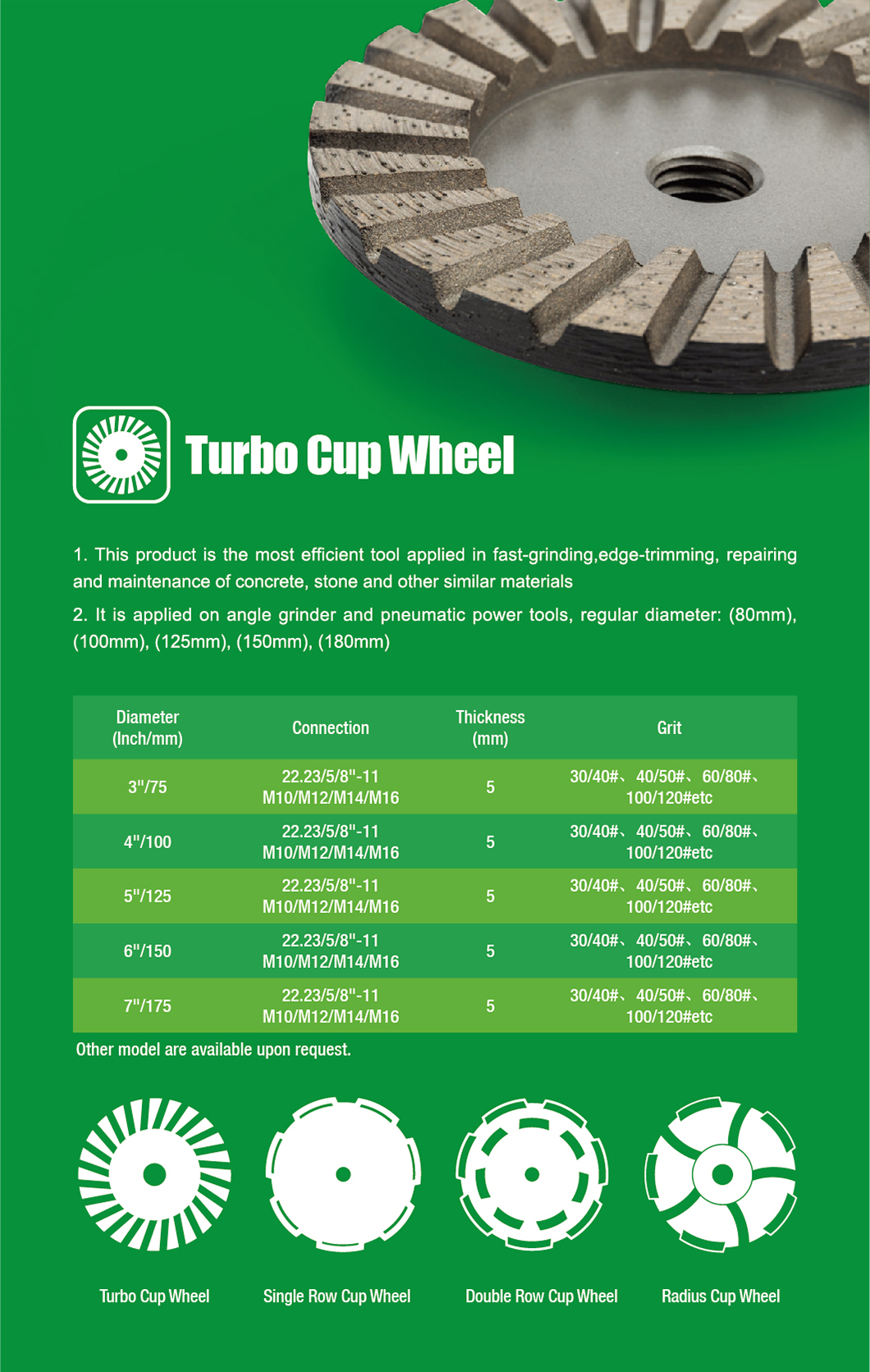 Diamond Cup Wheels are designed for stone edge chamfer and surface grinding or for floor surface preparation and grinding. Turbo Cup Wheels and Double Row Cup Wheels suggested for stone and floor grinding. For floor grinding, special design of different segment type available upon request, such as T-Segmented, Swirl Segmented and many others for floor professional grinding jobs.