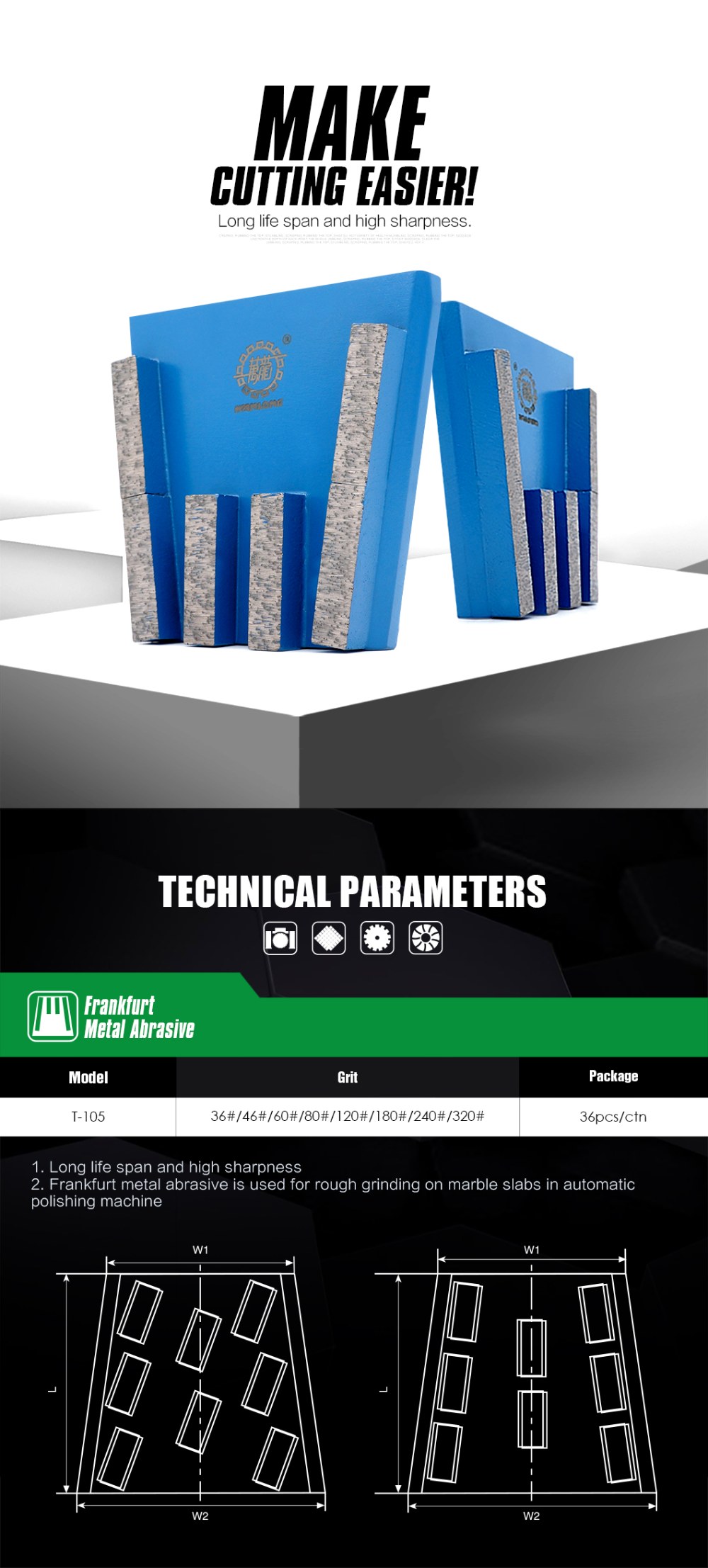 Frankfurt metal abrasive is used for calibrating, leveling, and polishing the rough marble, and concrete.
